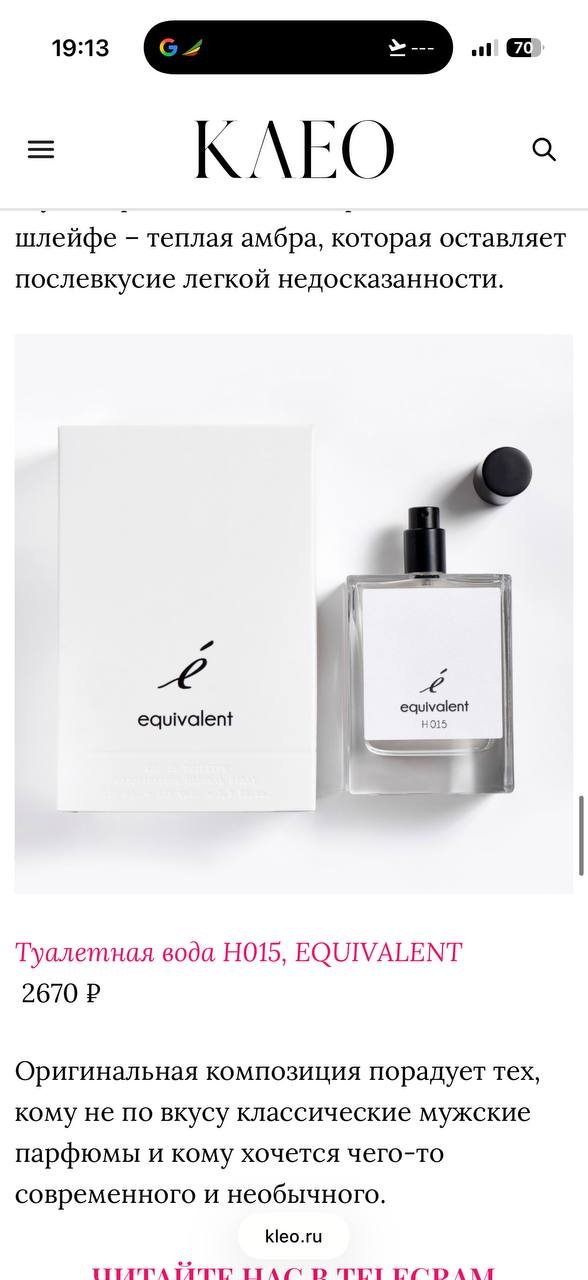 Женский сайт Kleo.ru с ежемесячной аудиторией 327 тысяч человек опубликовал статью «Гаджет для головы, аромат Дукати и барбершоп на дому: идеи впечатляющих подарков на 23 февраля». В этот материал, призванный помочь выбрать по-настоящему желанный презент для мужчин, вошла туалетная вода H015 от бренда EQUIVALENT.