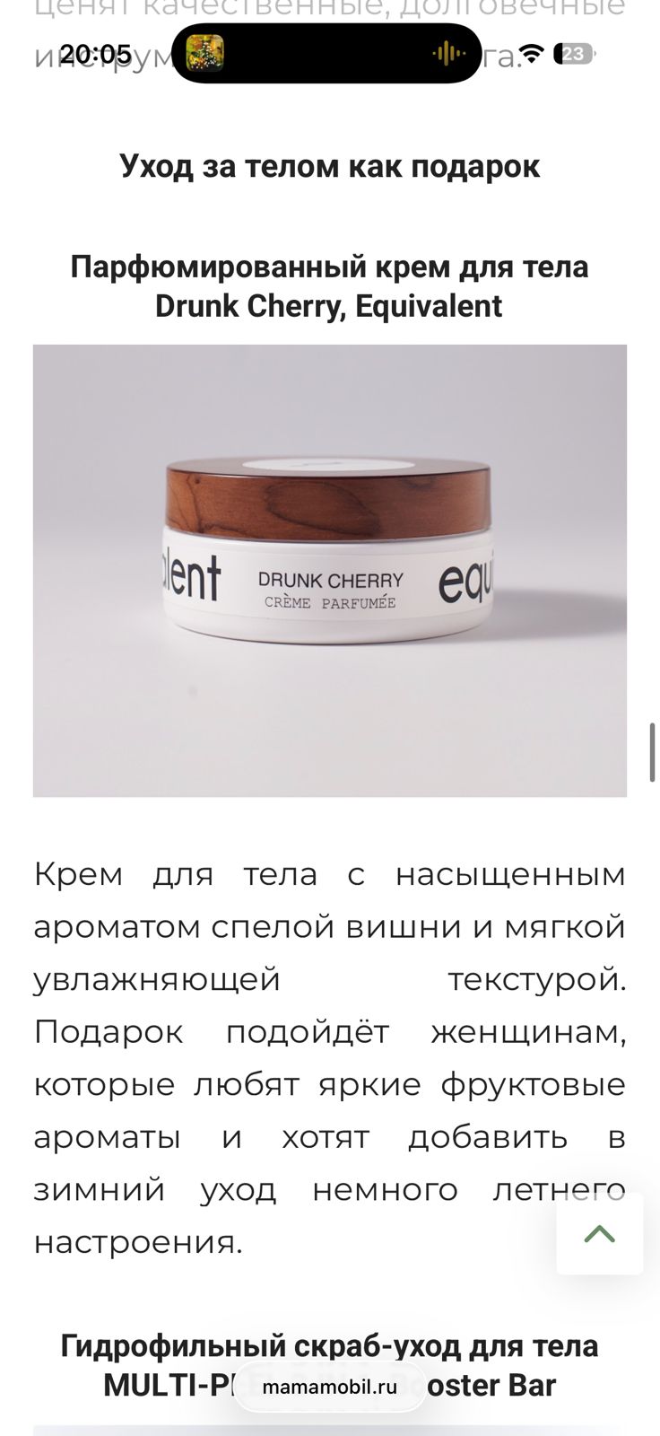 Специализированный сайт для мам Mamamobil.ru (ежемесячная аудитория — 60 тысяч человек) включил парфюмированный крем Drunk Cherry от бренда EQUIVALENT в свою большую праздничную подборку «Новогодние подарки для женщин: 40 идей на любой вкус и бюджет».