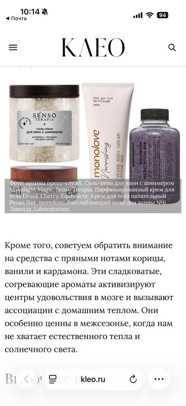 Популярный женский портал Kleo.ru с ежемесячной аудиторией 250 тысяч человек включил парфюмированный крем Drunk Cherry от бренда EQUIVALENT в свою новую подборку средств для борьбы с осенней хандрой. В статье «Как ритуалы спасают от осенней хандры» крем представлен как ключевой элемент вечернего ритуала заботы о себе, способный превратить рутину в момент наслаждения.