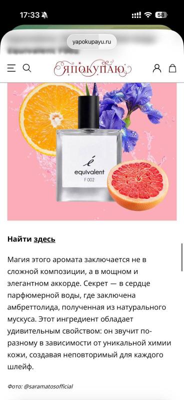 YaPokupayu.ru поставил аромат Equivalent F002 в один ряд с нишевой парфюмерией